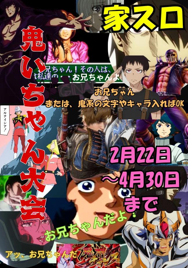 ■概要 お兄ちゃん(疑似お兄ちゃんも可)キャラか鬼の文字やアイテムやキャラが出る5号機or6号機(コインタイプ)で差枚数を競う大会です。ボナタイプ3000〜10000G ATまたはART疑似ボ系IN9000〜30000回して一番出た人が優勝! 我こそはお兄ちゃんキャラと鬼系のここを見て欲しい人はタグ→#鬼いちゃん大会 つけて気合いの写メ投稿を宜しくお願いします。(粗品アリ)🤗 ◾️参加可能機種・設定 ・5号機または、6号機(コインタイプ) ・設定 いくつでも ・エントリー最大4台まで! ※一度参加した機種で再エントリーは不可 ■参加条件 ・Xアカウントをお持ちの方 ・IN枚数と差枚数が分かるデータカウンターをお持ちの方 ・設定変更時の写真が撮れて最終ゲーム数と差枚が分かればゲーセンもOK ・裏モノ参加OK ・白ロム、赤ロムはNG ■必須事項 ・実戦開始時、Xにて設定変更時の写真と #鬼いちゃん大会のハッシュタグをつけて開始ポストをお願いします ・3000G〜10000またはIN9000〜30000枚(±2枚)まで回してください ・設定変更からやり直しなしの1発勝負 ・実戦途中での設定打ち直しは禁止 ・データカウンター異常やキャパシタ切れ等で設定が変わってしまった場合は主催者 hagi@maiya に連絡後、再度開始ポストをお願い致します ・結果が気に入らないから再送は✖️ ⚠️わざとボーナスを揃えなかったりARTを転落させたりなど、意図的に差枚を減らす行為は禁止です⚠️ ■景品 差枚優勝位 粗品 キングオブお兄ちゃん! (お兄ちゃんキャラベスト写メ)超粗品 アルティメット鬼いちゃん! (鬼系のベスト写メ)クソゴミ ■エントリー方法 ・このページ下部の参加ボタンからお名前、機種名、設定、機械割等、必要項目を入力してください ※左上の↓を押すと一気に飛べます。 ・ステータスが [参加中] になれば報告可能となります。 ・機種の変更がある際は追加でエントリーをしてエントリーコメントに変更の旨をご入力ください。変更前のエントリーはこちらで削除いたします。 ■報告について ・報告期間内にエントリーリストの確認→報告ボタンから結果データと証拠写真をお送りください。 ・報告用パスワードを忘れてしまったら hagi@maiyaまでDMにてご連絡ください。こちらでパスワードをリセットし、新しいパスワードをお送りします。 ■その他(読まなくても大丈夫) ・配信は自由です。差枚も公開OK ・写真の投稿は1度に4枚までですが、再度編集画面に入れば追加できます。 ・一撃獲得枚数、好きな演出などの写真を投稿して大会終了後みんなに見てもらいましょう。 ・実戦データは他の大会と併用OKですが、今大会は終了翌日に結果発表を行いますので、ご迷惑のかからない様ご注意ください。 ・投稿内容は結果発表時にすべて公開されます。内容にはくれぐれもお気をつけください。 ・配信等による開会式は行いません。開始日0時からスタートしてOKです。開始ポストをお忘れなく。 ・結果発表は5月の頭を予定してます。 ・大会参加にあたり主催者hagi@maiyaへのフォローは不要ですが、何かしらの賞に当選した場合はDMでお渡しする為、こちらからフォローをお願いする場合がございます。 ご質問等ありましたらhagi@maiya までお気軽にどうぞ |